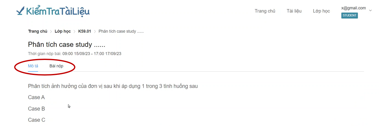 Hệ thống chia ra làm 2 loại bài nộp trong lớp học, 1 loại không kiểm tra trùng lặp và 1 loại có kiểm tra trùng lặp. Tài liệu yêu cầu kiểm tra trùng lặp sẽ được ghi chú bằng dòng chữ: *\* Bài nộp là những tài liệu đã kiểm tra trong danh mục tài liệu của bạn.*