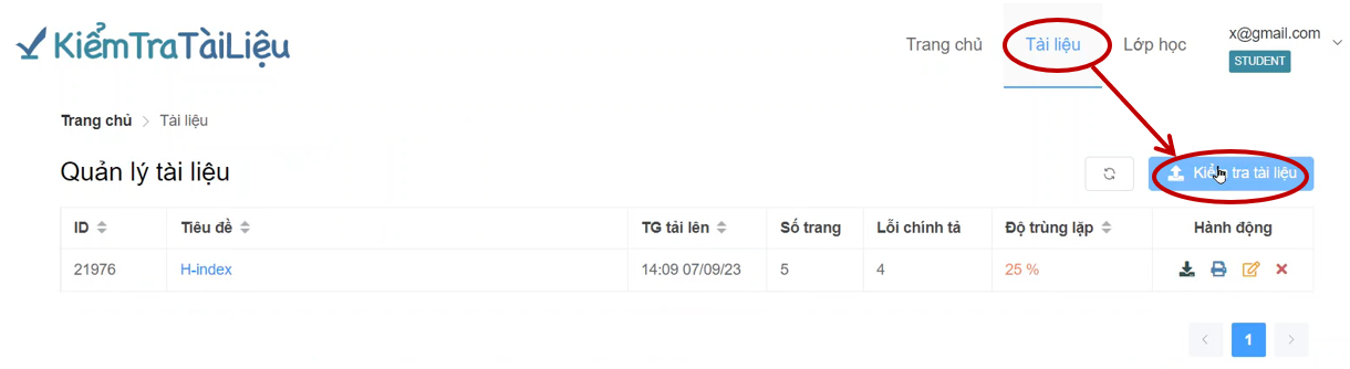 &#x20;     Học viên chọn mục Tài liệu sau đó tải tài liệu lên kiểm tra trùng lặp như hình dưới, tham khảo hướng dẫn tải tài liệu kiểm tra trùng lặp theo [hướng dẫn tải tài liệu lên kiểm tra](https://manual.kiemtratailieu.vn/tai-tai-lieu-len-kiem-tra).