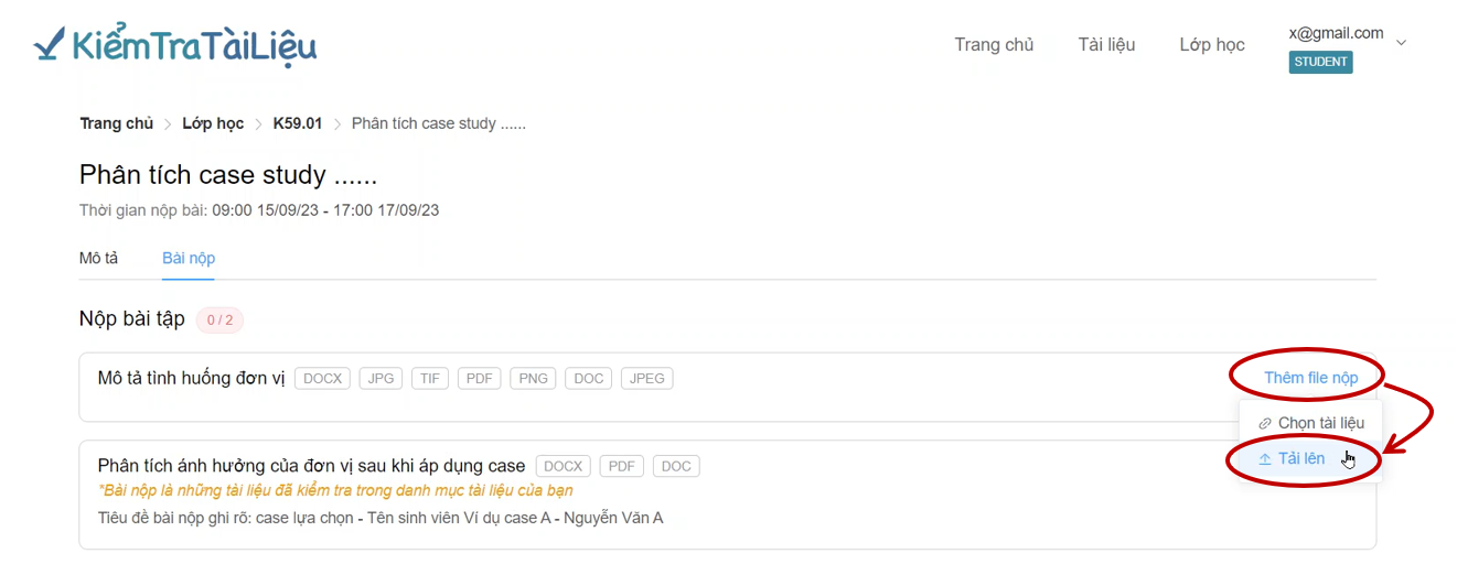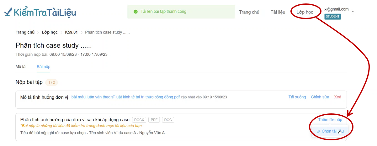 &#x20;       Sau khi tải tài liệu lên kiểm tra trùng lặp, học viên vào lại Lớp học tại mục Bài nộp chọn Thêm file nộp để lựa chọn bài nộp.