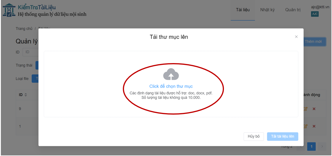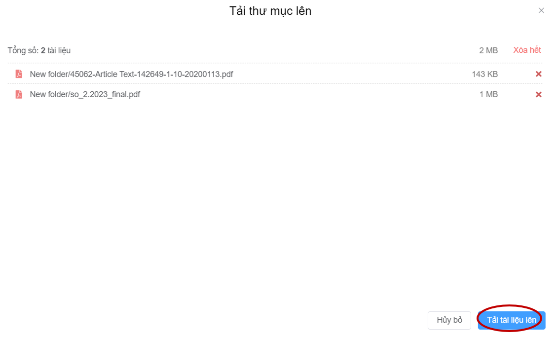 Hệ thống sẽ liệt kê ra tất cả các tài liệu trong thư mục để admin kiểm tra lại danh sách tài liệu (có thể loại trừ tài liệu bằng cách ấn dấu X để xóa 1 hoặc 1 vài tài liệu, xóa hết để xóa hết danh sách tài liệu) => Chọn **Tải tài liệu lên**